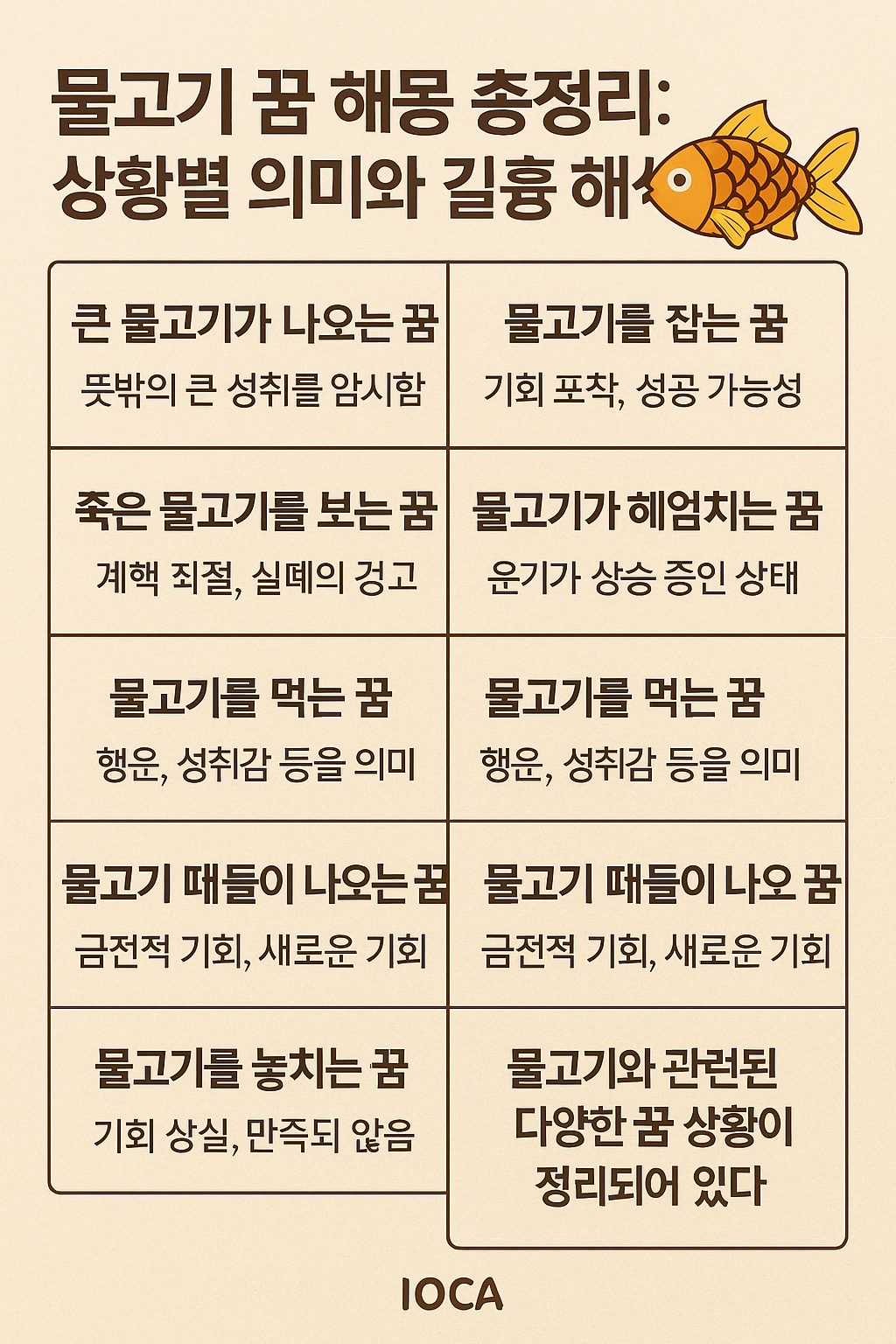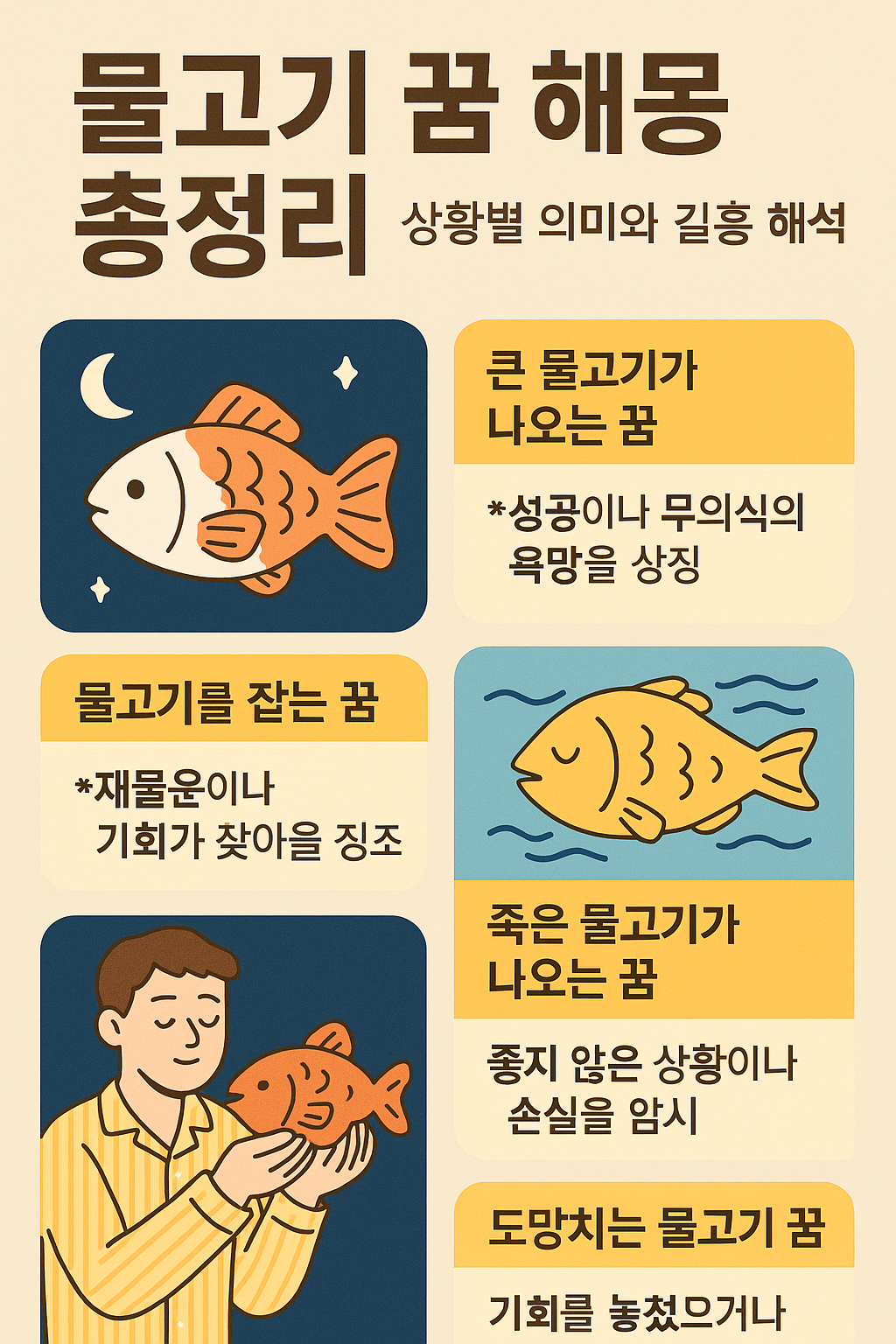 이번 글에서는 물고기 꿈을 상황별로 나누어 길흉 해석을 총정리했습니다.
